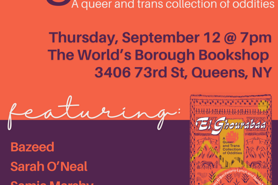 A Room of One’s Own Bookstore in Madison, WI, will be hosting a launch of El Ghourabaa featuring co-editor Eli Tareq El Bechelany-Lynch and anthology contributor Bazeed in conversation with Fawzy Taylor.