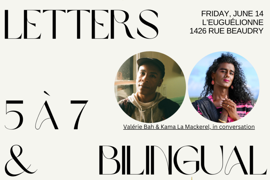 Join us for a casual 5 à 7, bilingual reading, and brief conversation between THE RAGE LETTERS author Valérie Bah & translator Kama La Mackerel.