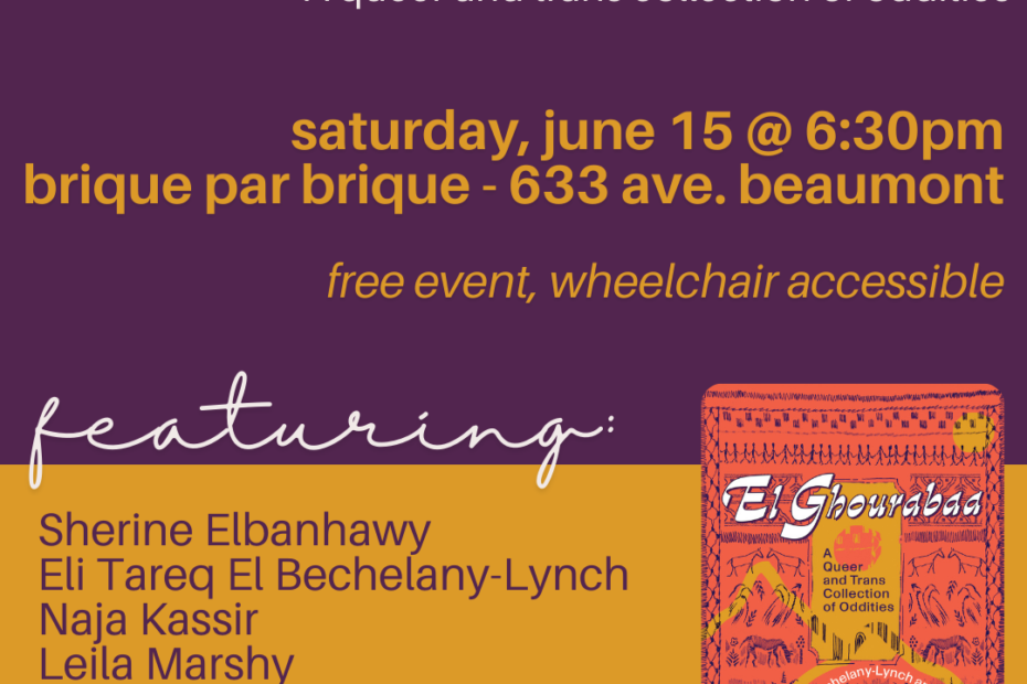 Join us for the hometown launch of El Ghourabaa: A queer and trans collection of oddities. Featuring Sherine Elbanhawy, Eli Tareq El Bechelany-Lynch, Naja Kassir, Leila Marshy, Samia Marshy, Nofel, and Olivia Tapiero.