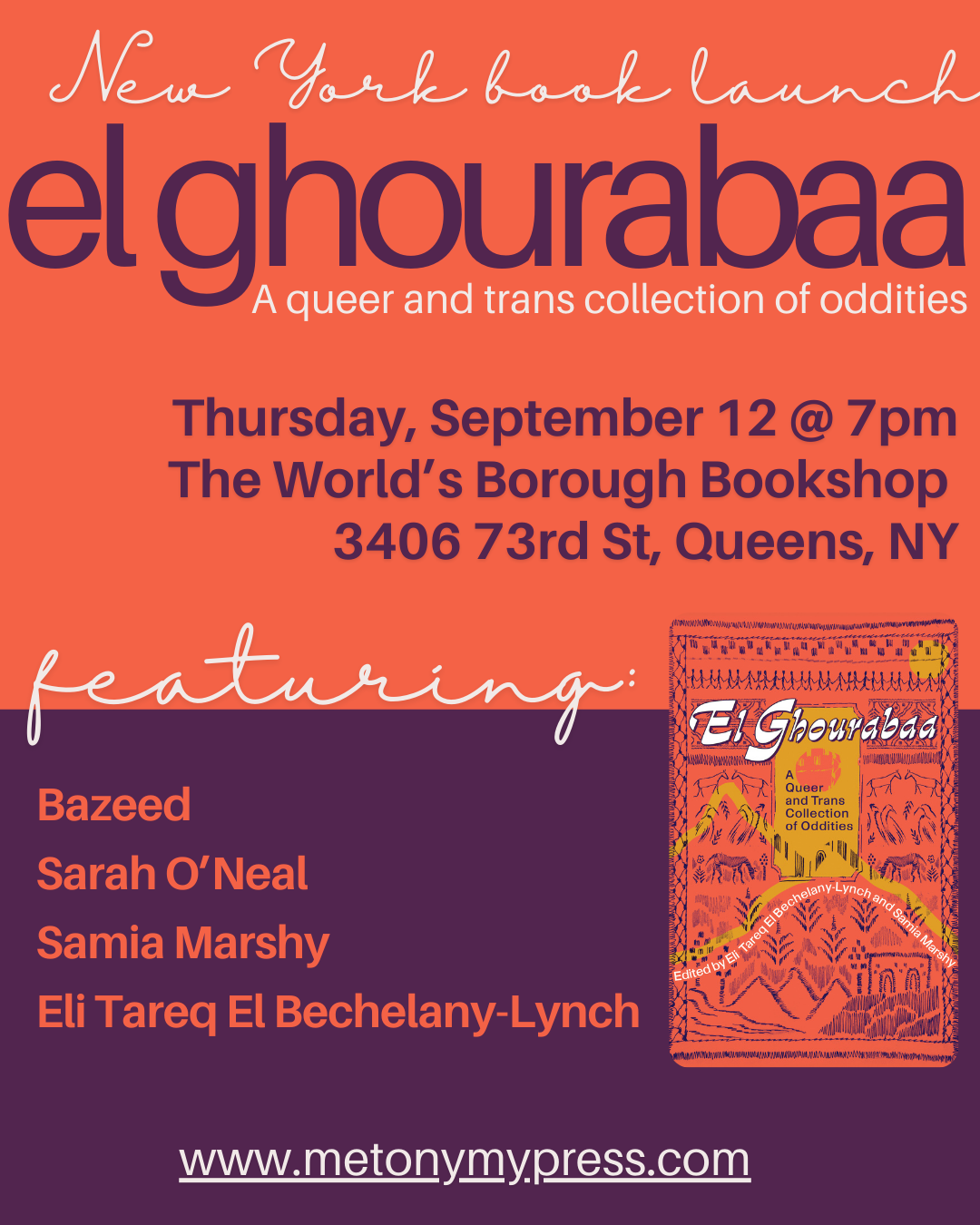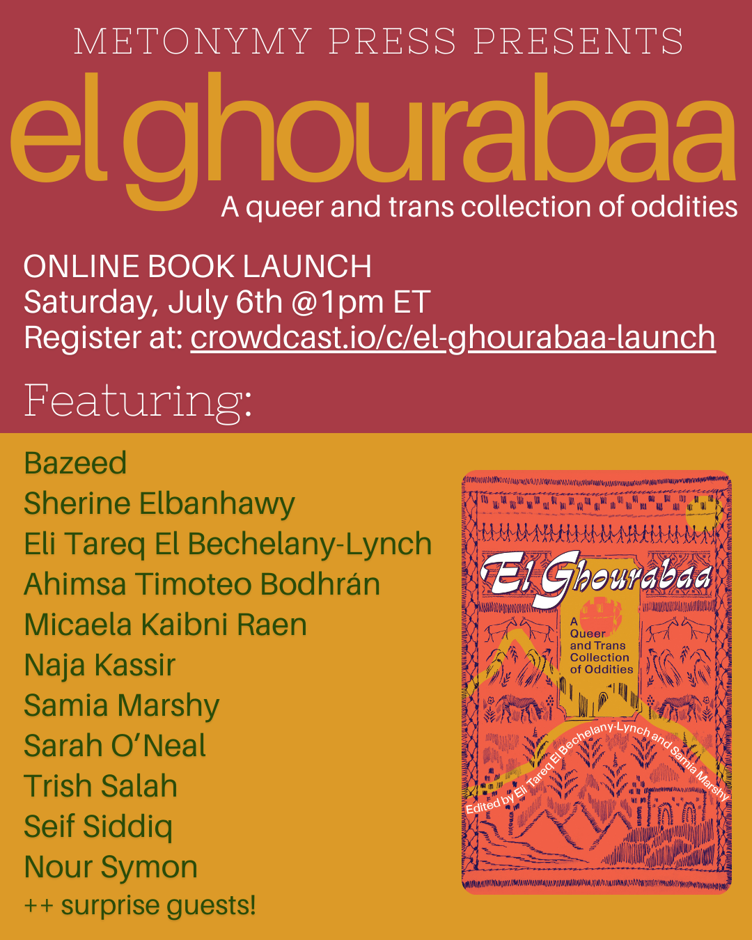 onlineJoin us on July 6th at 1pm for our virtual launch of El Ghourabaa: A Queer and Trans Collection of Oddities, edited by Eli Tareq El Bechelany-Lynch and Samia Marshy!