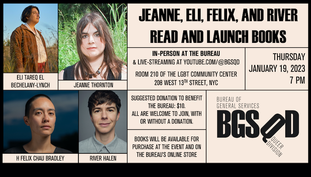 bgsqd 208 West 13th Street, New YorkFour acclaimed trans authors based in Canada and New York read from their latest works: H. Felix Chau Bradley reads from Personal Attention Roleplay; River Halen reads from Dream Rooms; Eli Tareq El Bechelany-Lynch reads from The Good Arabs; Jeanne Thornton reads from Summer Fun and/or new work. Personal Attention Roleplay is praised by Casey Plett as “a perfect album of stories”; Dream Rooms is described by Gail Scott as “a marvelous confection of the author’s definition of ‘revolution’”; and The Good Arabs as “bold and deeply necessary” by Liz Howard. Summer Fun won the 2022 Lambda Award for transgender fiction.