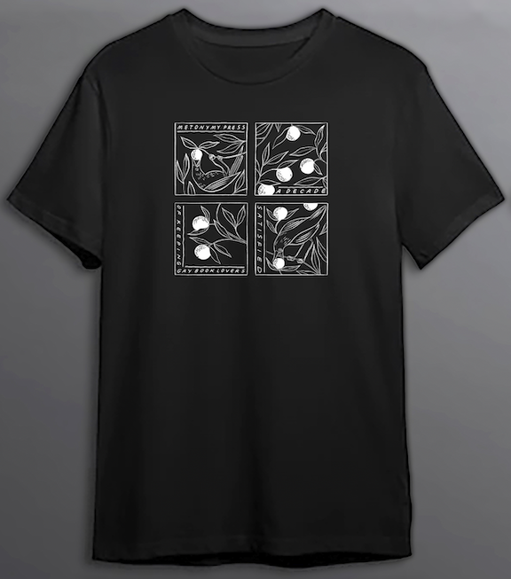 In honour of our tenth anniversary, we are delighted to offer t-shirts designed by artist Lee Lai. They are printed on 100% cotton. T-shirts are black with a white graphic featuring birds eating berries from leaves and text that reads “Metonymy Press. A decade of keeping gay book lovers satisfied.” Shirts come in sizes S – XXL. While quantities last!