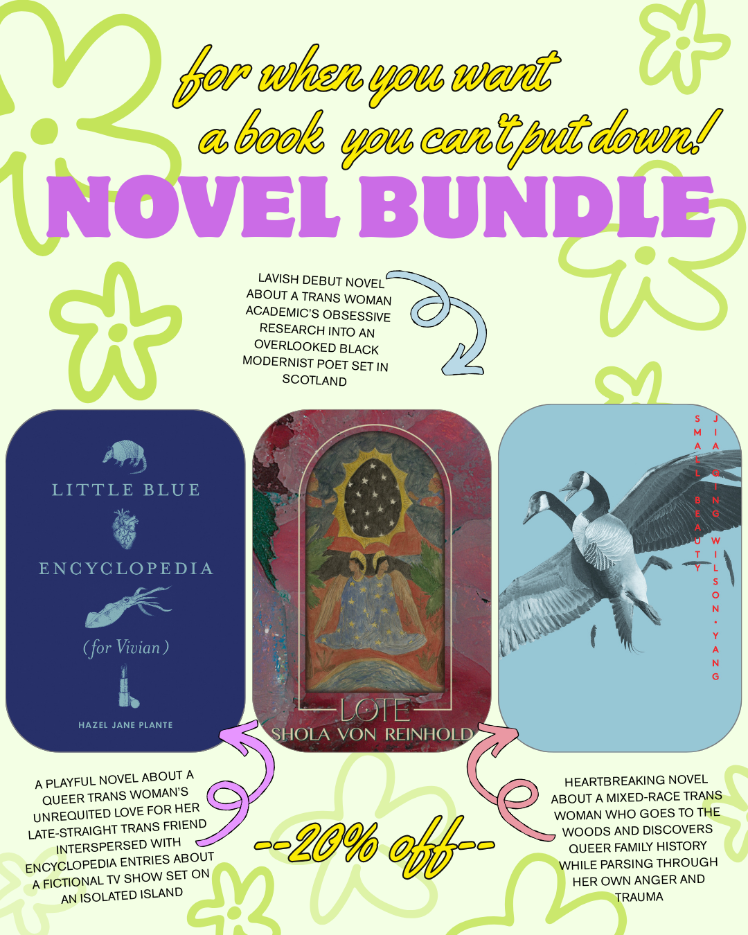 The playful and poignant novel Little Blue Encyclopedia (for Vivian) sifts through a queer trans woman’s unrequited love for her straight trans friend who died. A queer love letter steeped in desire, grief, and delight, the story is interspersed with encyclopedia entries about a fictional TV show set on an isolated island. The experimental form functions at once as a manual for how pop culture can help soothe and mend us and as an exploration of oft-overlooked sources of pleasure, including karaoke, birding, and butt toys. Ultimately, Little Blue Encyclopedia (for Vivian) reveals with glorious detail and emotional nuance the woman the narrator loved, why she loved her, and the depths of what she has lost.